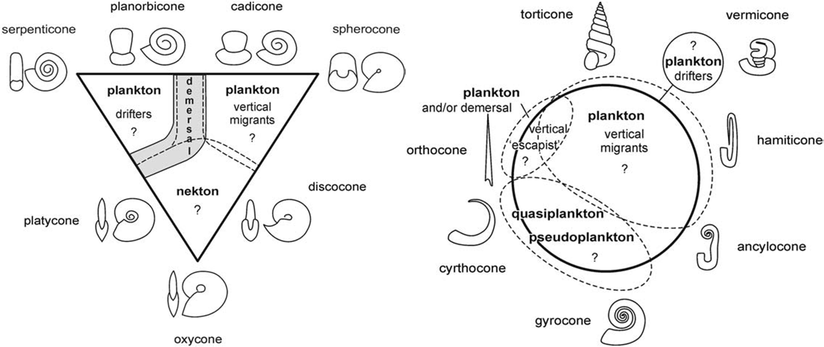 Given the wide diversity of coiling patters, a common life style seems unlikely. Most monomorphic ammonoids are considered to have been pelagic (roughly equally divided between drifters, swimmers and vertical migrants), with a few bottom-feeders.