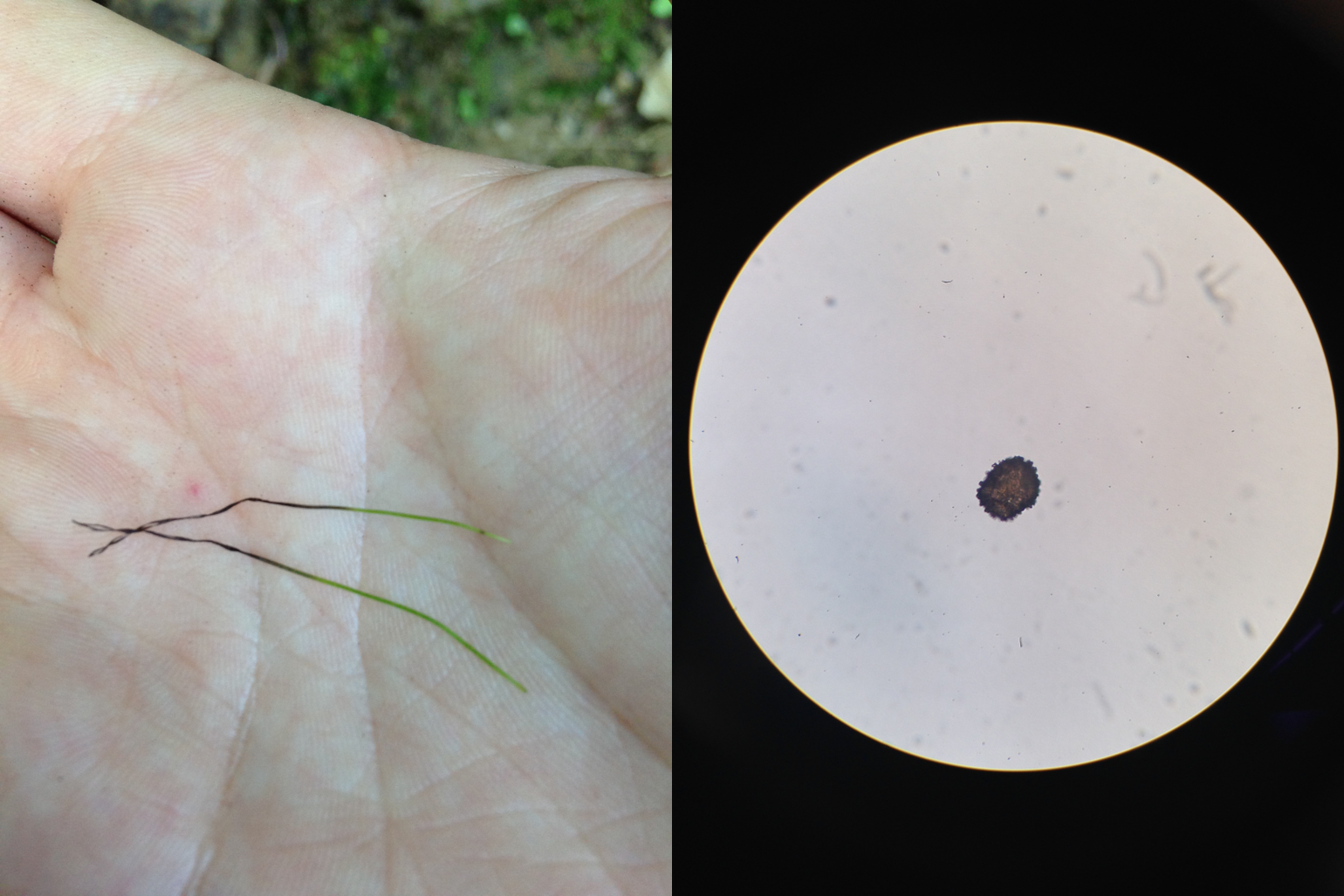 I took one of the black hairs in my hand, and I noticed that it was actually divided in two halves, opening from top to bottom. I realized that I had come across a hornwort sporophyte, and proceeded to jump with joy.