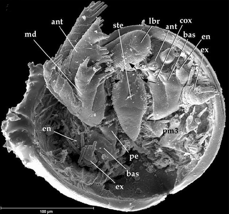 Similar to bradoriids or the extant ostracodes, the body of phosphatocopids is enclosed in a carapace. Microscopic specimens in ‘Orsten’ deposits show that their body is very different from bradoriids, and show more derived features, such as mandibles. Phosphatocopids may be the larvae of some of the first crustacean groups, like barnacles, but their position is also in discussion.