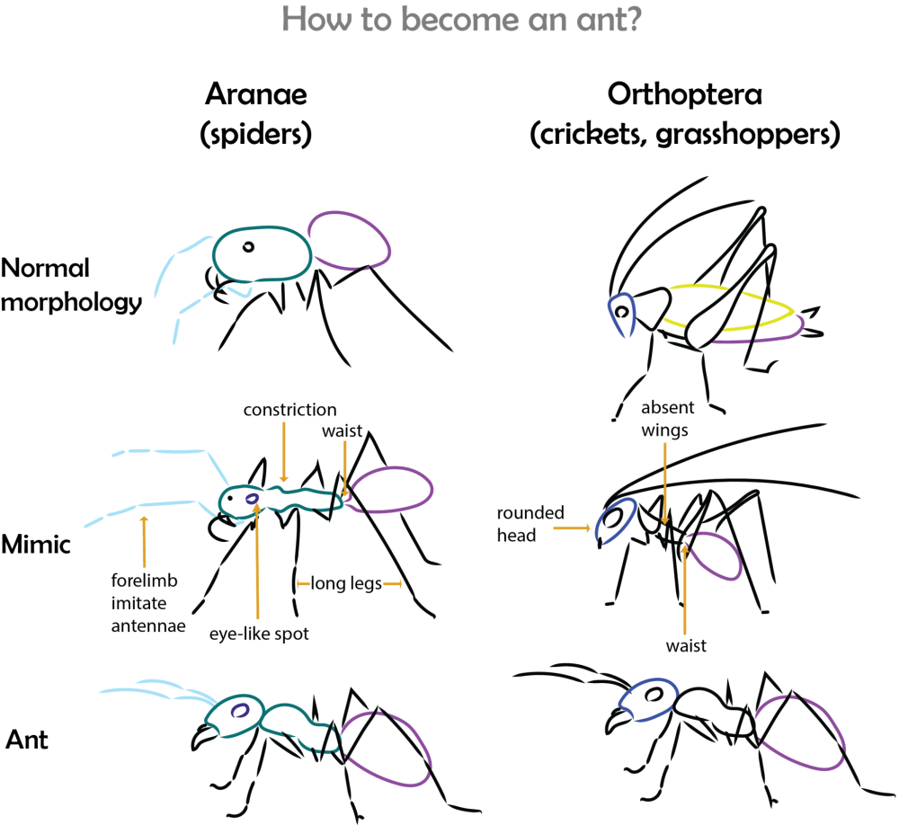 Evolution has managed to shape the morphology of butterflies, grasshoppers or stick insects into stereotypical ant features. Most ant-mimics share common ant-like traits: club-shaped antennae, a rounded head with large eyes and mandibles, reduced or absent wings, long legs, a waist separating the thorax from the abdomen or a brown to black colour. But not all traits can be changed to resemble ants.