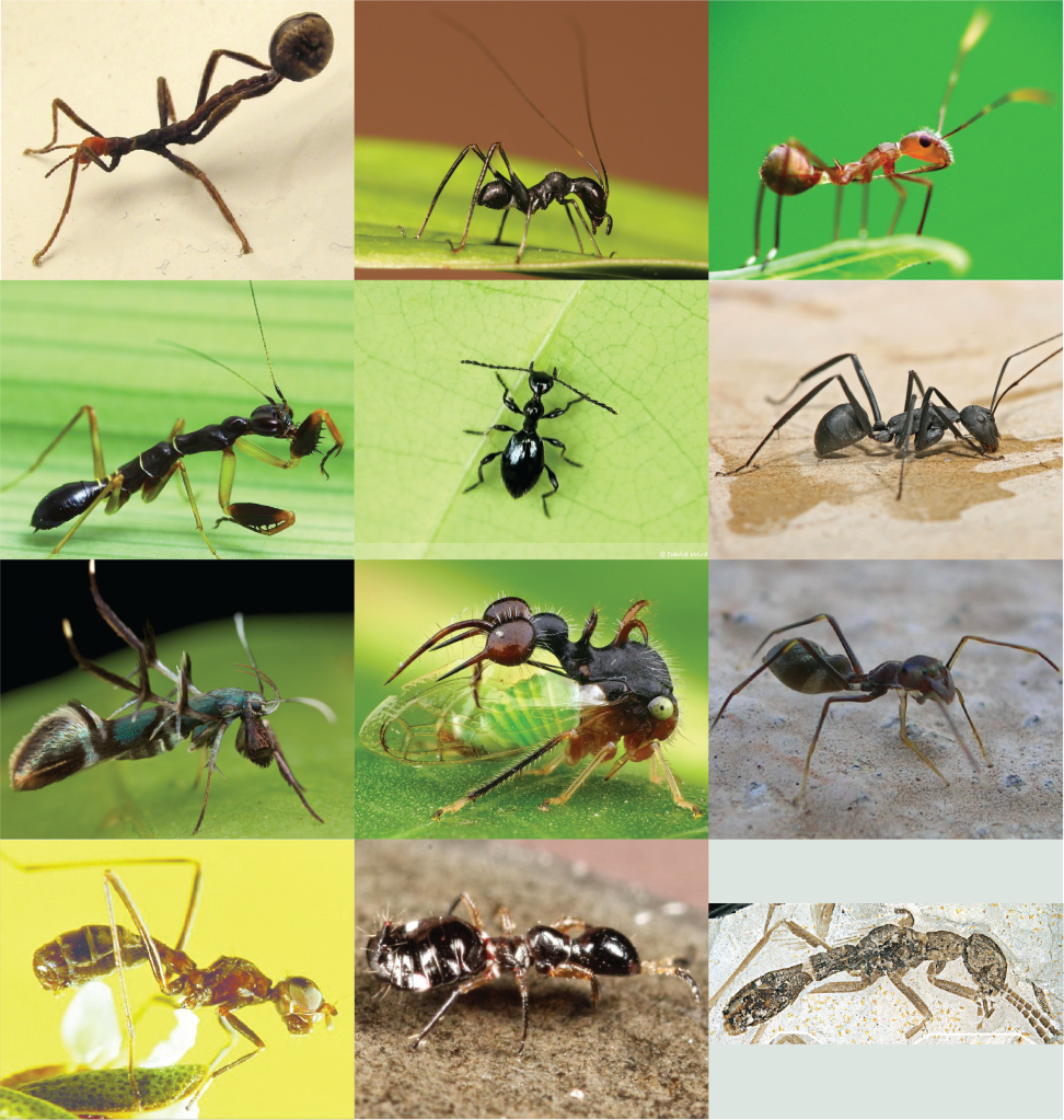 *The ant is in the second row, right picture. The remaining are ant mimics belonging to the following groups (from upper row to lower row, from left to right): Phasmatodea (Extatosoma tiaratum, Wikipedia), Orthoptera (Macroxiphus sp. Wikipedia), Heteroptera (coreid bug nymph, Wikipedia), Mantodea (unknown, Eddy Lee), Coleoptera (Anthelephila, Singapore Geographic), The ant (Camponotus sp., Wikipedia), Lepidoptera (Xestocasis, Paul-flickr), Homoptera (Cyphonia clavata, Maderspacher et al., 2011), Araneae (Myrmerachne, Wikipedia), Diptera (Badisis sp., Yeates et al., 2009. Brill), Thysanoptera (Compsothrips sp., Charley Eiseman), Blattodea (Grant viridifluvius, Vršanský et al., 2018).