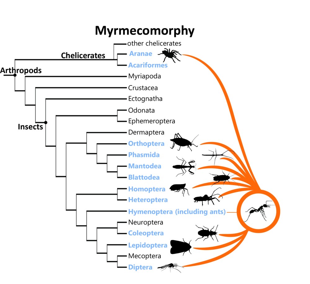 Just as a stick insect has evolved to closely mimic a twig, all these species have evolved into an ant-like shape, thus becoming “myrmecomorphic”, or ant mimics. The abundance of ants and the advantages their society provides are responsible for the success of the myrmecomorphic strategy. But which are those advantages?